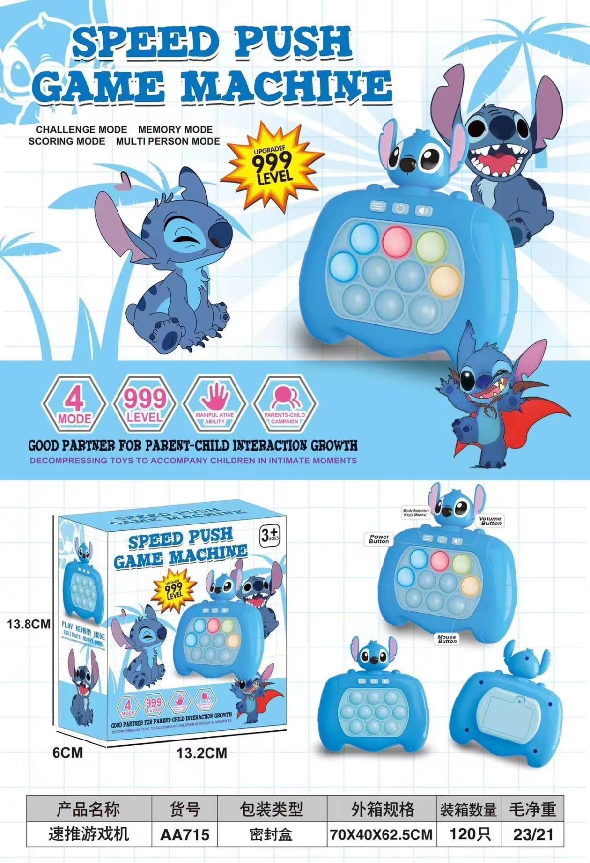 PREZENT STITCH ZABAWKA SENSORYCZNA POPUSH GRA KONSOLA BUBBLE NIEBIESKI